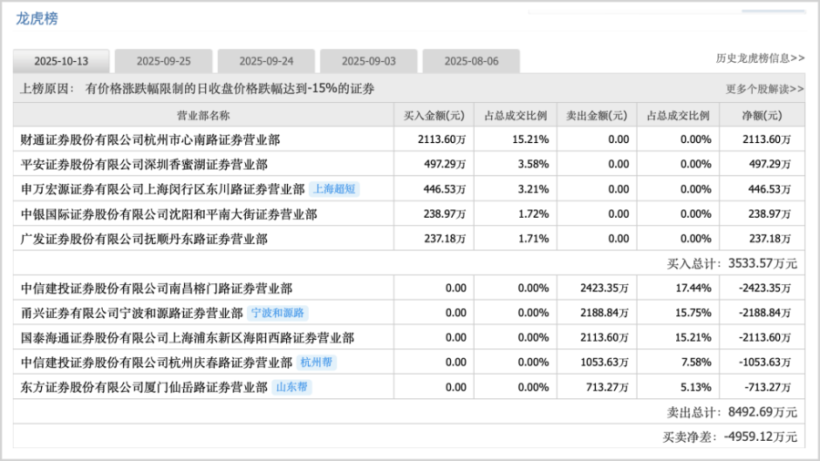 10月13日,上纬新材开盘一字跌停,封单超10万手,后一个交易日继续大跌15%(此后进入调整状态)。