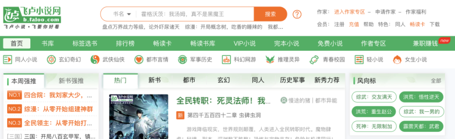 飞卢小说网始建于 2005 年,以 35% 以上的男性作者占有率晋升国内 “小说阅读” 网站前五,日活跃用户超过 300 万。平台现有驻站作家约 10 万 +,原创作品 60 万部以上,且每年稳步增长。值得注意的是,番茄小说黑马榜60%的作者是从飞卢小说网开始写作,起点中文网12天王中10位作家来自飞卢小说,飞卢可谓是男频的发源地。