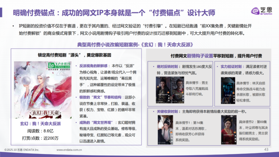 艺恩报告中就提到一个典型案例。飞卢上阅读量8.6亿、打赏近200万的大IP《玄幻:我!天命大反派》,在改编成同名短剧时,小说中吸引用户付费的剧情钩子可以平移至短剧,成为付费锚点。比如第69集师尊与叶尘决裂,决定归顺男主,男主获得系统奖励的关键收获时刻,以及剧中配角多次想使出绝招却被男主一一化解的实力验证时刻,都与小说情节一一对应。