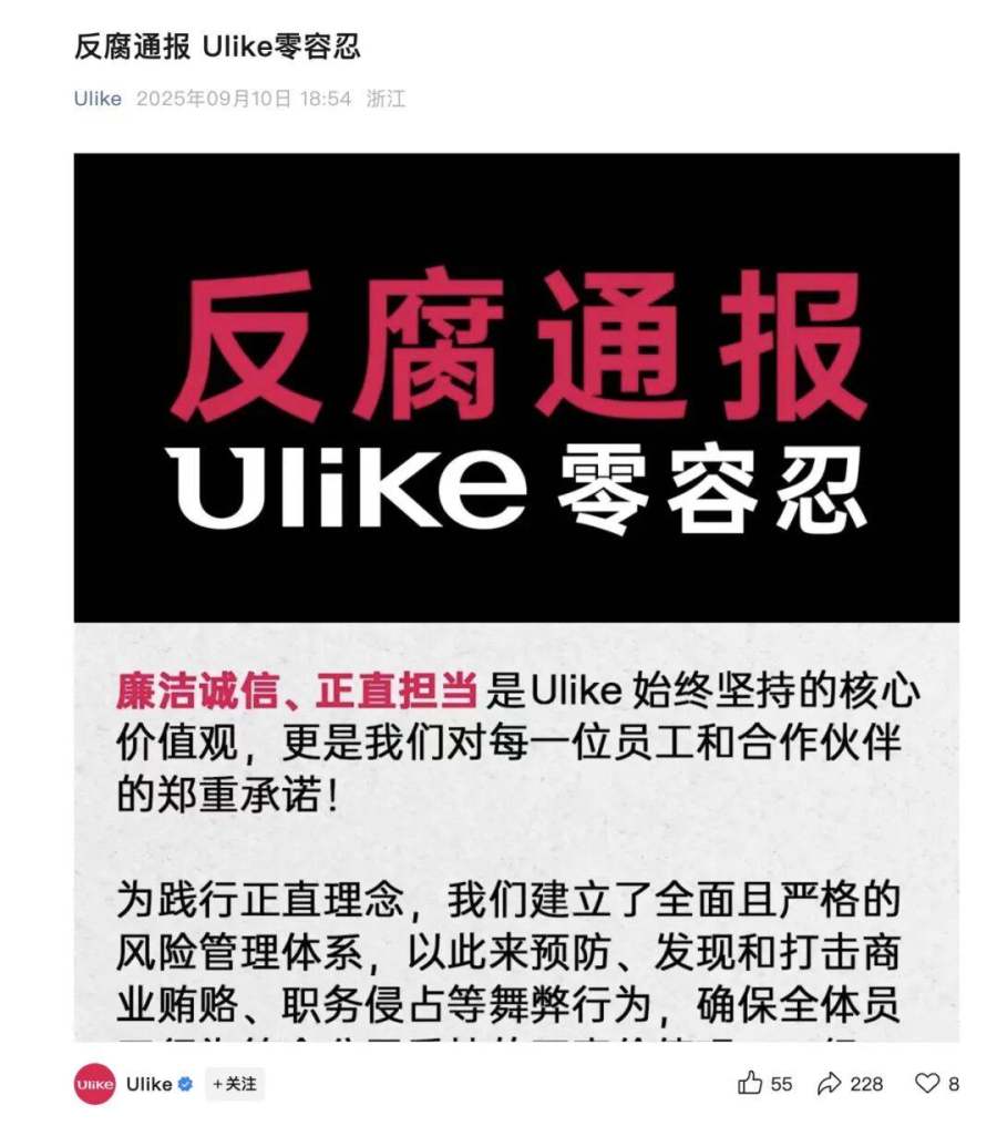 2025年,Ulike的一则内部反腐通报如同一枚重磅炸弹,在业界引起了轩然大波。通报显示,由莱集团监察部门在这一年中查处了多起违反企业“高压线”的案件,涉及研发、品牌设计、达人直播、供应链采购、海外营销等多个关键环节,12名涉嫌刑事犯罪的员工被移送公安机关。这一举动,虽然彰显了Ulike整顿内部纪律、维护企业形象的决心,但也不免让人对其内部管理产生质疑——一个需要如此大张旗鼓反腐的企业,其产品品质与服务质量究竟能否得到保障?