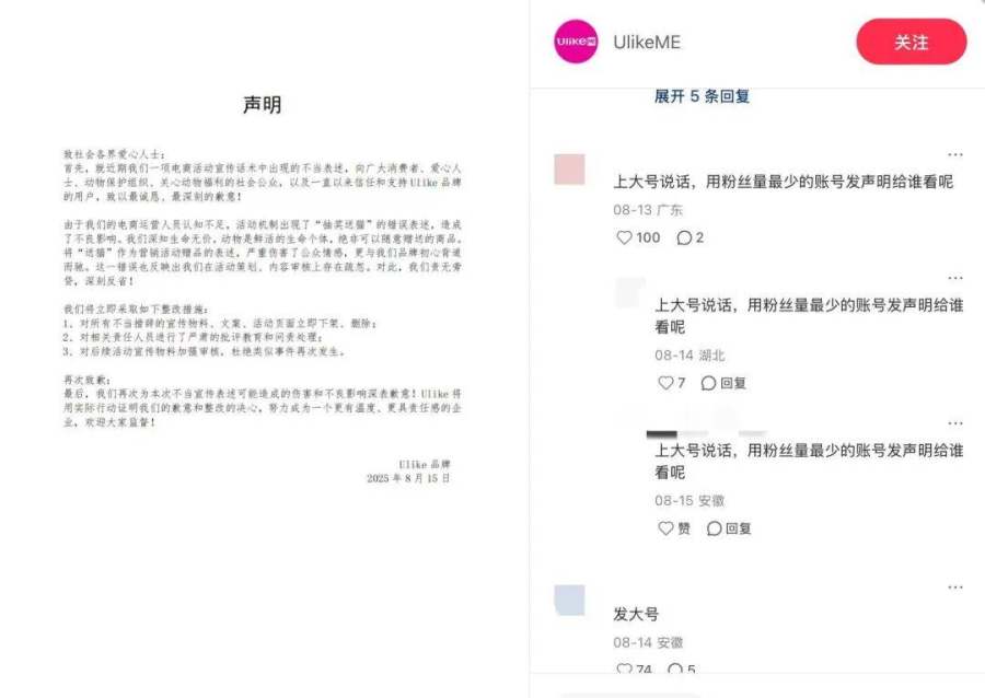 更令人震惊的是,今年8月初,Ulike在营销活动中竟试图利用动物作为噱头,宣称购买脱毛仪即可免费抽猫咪,此举迅速引发公众强烈反感,被指责为“不尊重生命”“助长乱繁育和遗弃现象”。最终,Ulike通过官方账号发布致歉声明称,由于电商运营人员认知不足,活动机制出现了“抽奖送猫”的错误表述,造成了不良影响,将对所有不当措辞的宣传物料、文案、活动页面立即进行下架、删除。