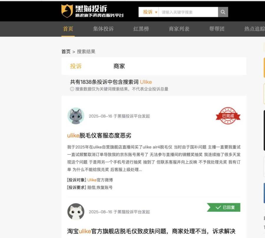 如果说营销争议还只是Ulike的“面子”问题,那么产品质量问题则是直接动摇其市场根基的“里子”危机。黑猫投诉平台上,关于Ulike脱毛仪的投诉量居高不下,高达1838条,其中不乏虚假宣传、欺骗消费者以及客服态度恶劣等严重问题。更有消费者投诉称,使用Ulike脱毛仪后出现皮肤红肿、疼痛、发黑及过敏等严重不良反应,而Ulike方面却拒不承认医院检查结果,拒绝承担责任。这样的处理方式,无疑是对消费者权益的极大漠视,也进一步加剧了其品牌信任的崩塌。