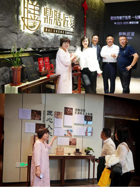 随后,代表团前往苏浙菜知名餐厅鼎膳匠宴(高铁新城店),重点参观了企业的“非遗匠人文化墙”。作为黑珍珠餐厅指南一钻餐厅,鼎膳匠宴将非遗技艺与餐饮制作深度结合,文化墙上展示的匠人故事与技艺传承历程,让代表团直观感受到“匠心入木”的餐饮精神。