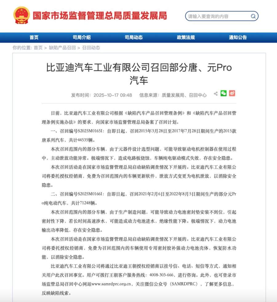 10月17日,国家市场监督管理总局官网发布一则召回公告,比亚迪汽车工业有限公司根据相关条例要求,启动共计115783辆汽车的召回计划。