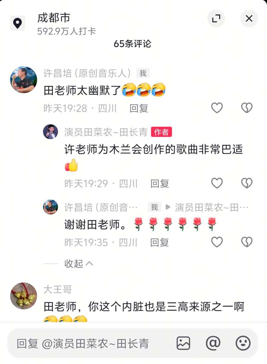 家人们,今天一定要给大家分享一首超火的歌曲——《盛邀木兰会》!最近,这首歌在网络上可是掀起了一阵热潮,更让人惊喜的是,它得到了四川巴蜀笑星之一田长青老师的公开赞美!在抖音短视频评论区,田长青老师毫不吝啬地表达了对这首歌的喜爱,那评论区的截图就像是一颗重磅炸弹,瞬间在音乐圈和广大网友中引起了轰动!