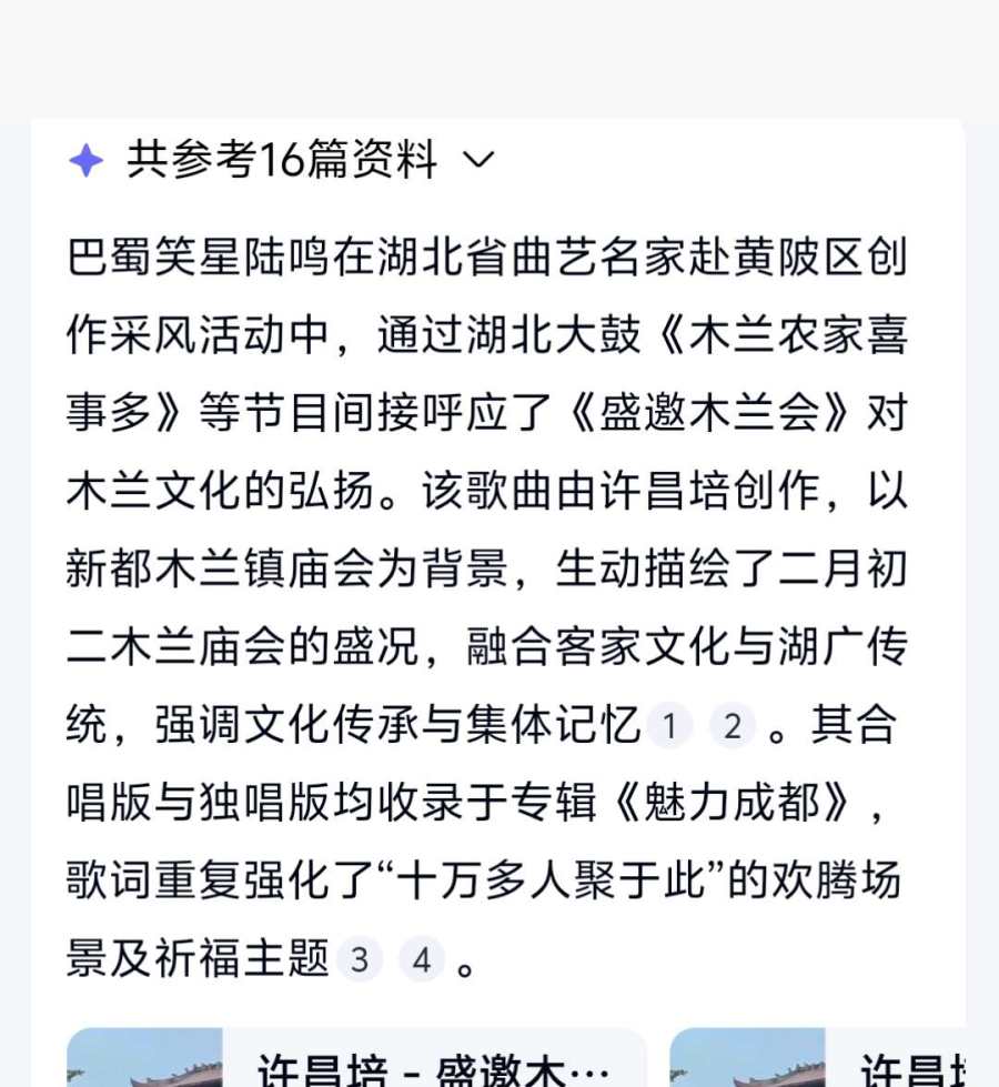 《盛邀木兰会》宛如一颗璀璨的明珠,用它独特的魅力照亮了音乐的天空。歌曲以成都市新都区石板滩街道木兰山木兰寺大庙会为蓝本,将庙会的热闹场景和深厚文化底蕴展现得淋漓尽致。“在那新都木兰镇,有座木兰山闻名,山上矗立木兰寺,承载岁月的情韵”,开篇几句歌词,就像一幅精美的画卷,徐徐展开,把我们带入了那个充满故事的地方。木兰镇、木兰山、木兰寺,这些名字本身就蕴含着无尽的神秘和魅力,让人忍不住想要一探究竟。