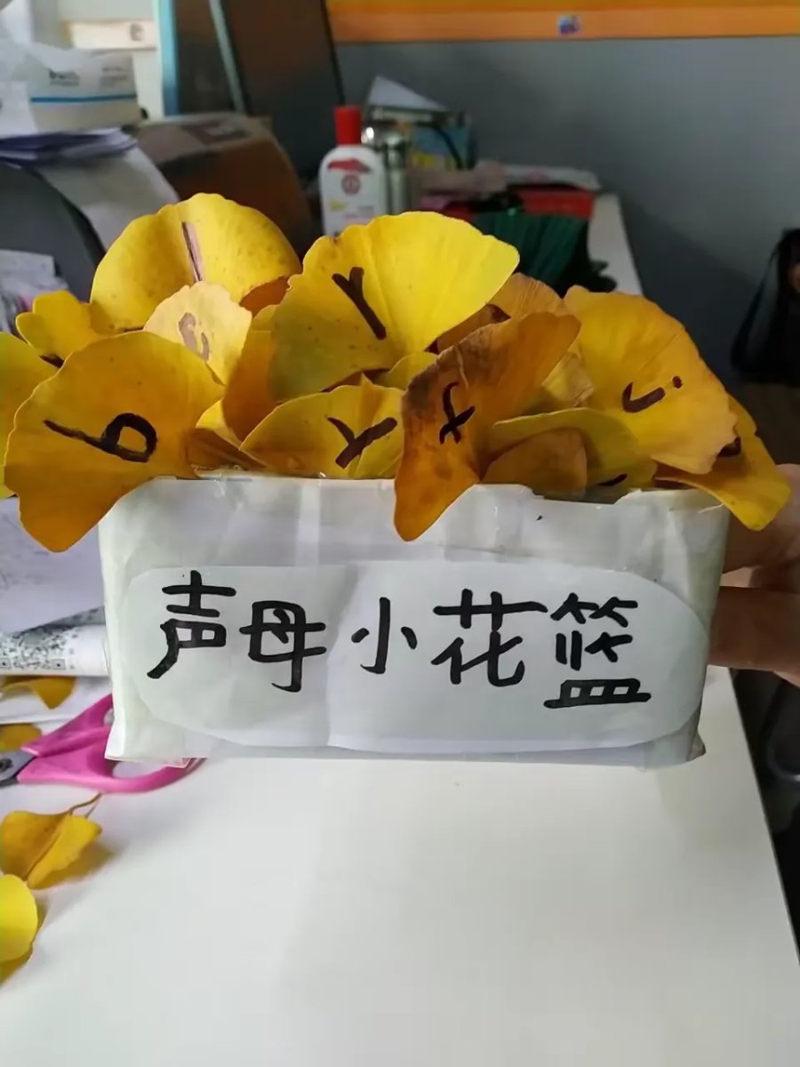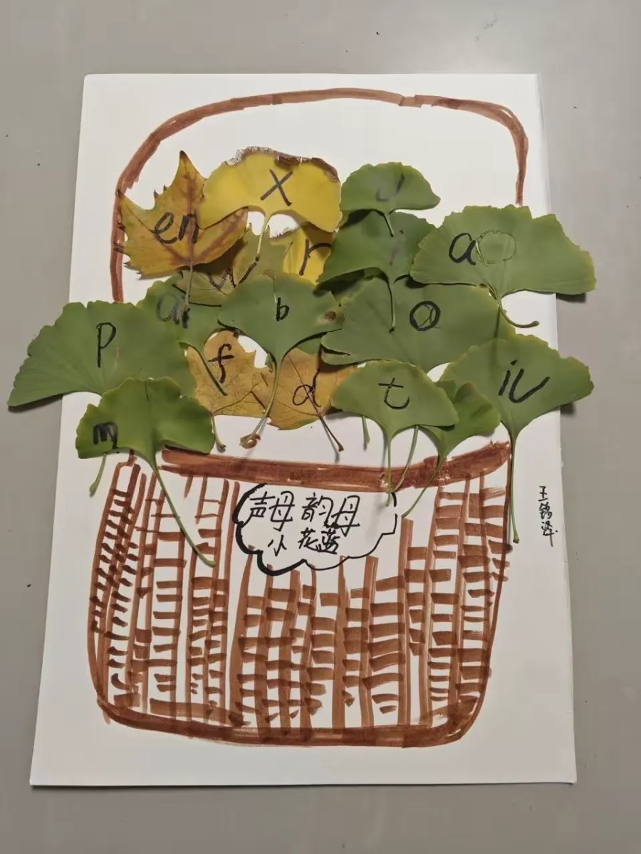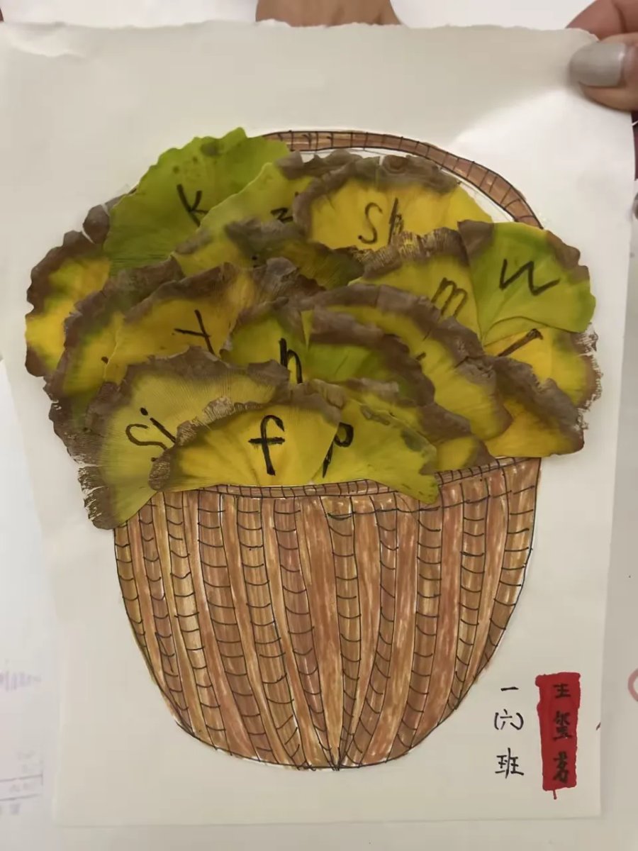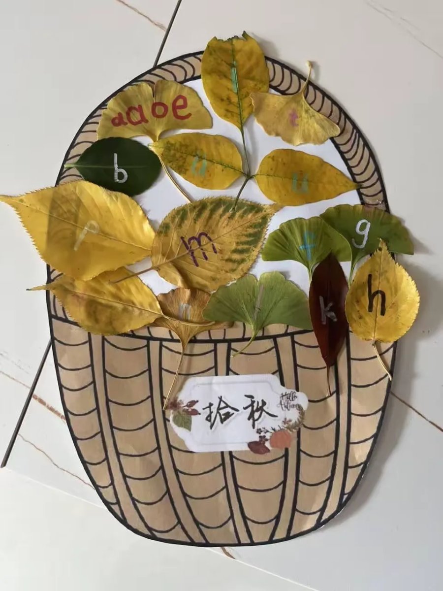 走出教室,孩子们化身“秋日拾光者”,俯身捡拾飘落的银杏叶、斑斓秋叶。小小的叶片成了天然的拼音卡片,稚嫩的笔触将“b、p、m、f”“a、o、e”细细书写,再把这些“拼音信物”妥帖收进“声母篮子”“韵母篮子”,每一片叶子都藏着对拼音的好奇。