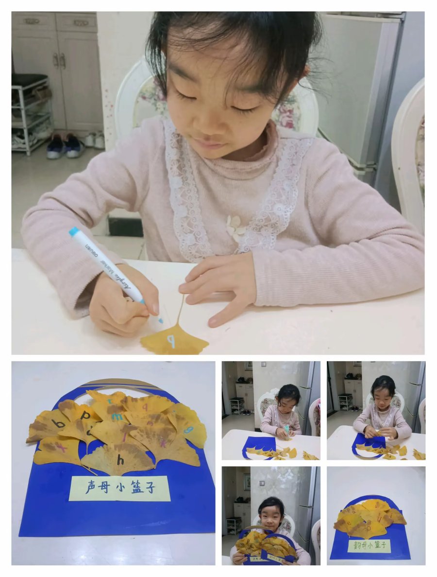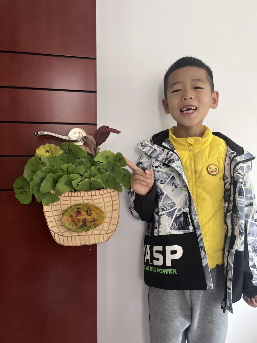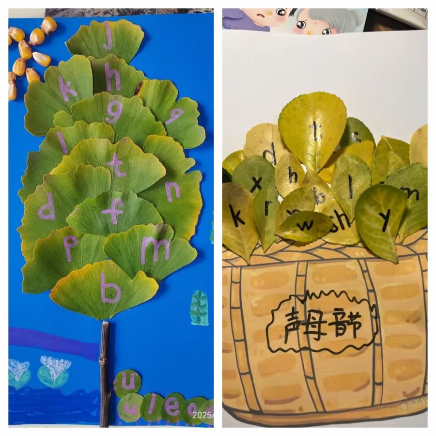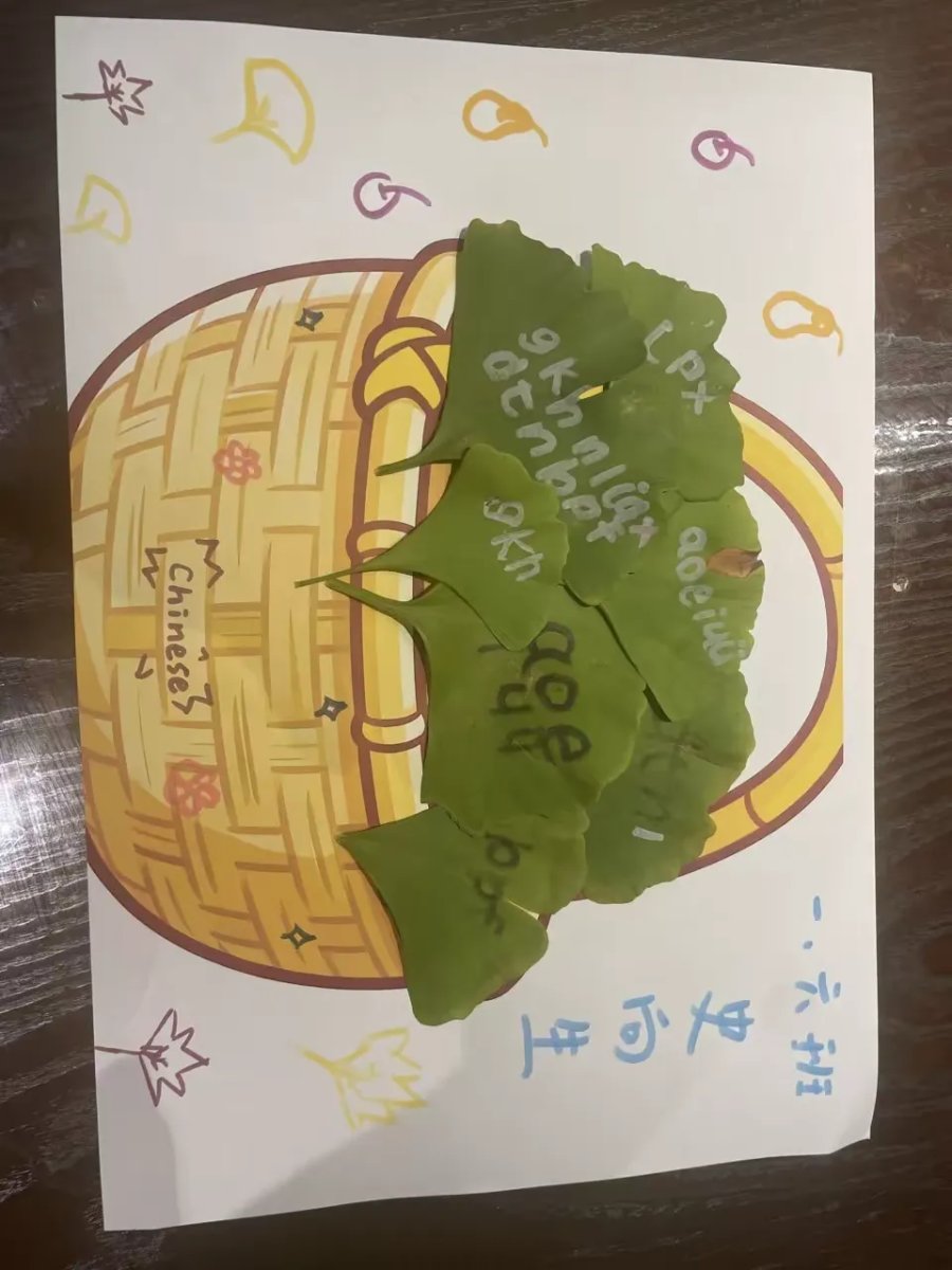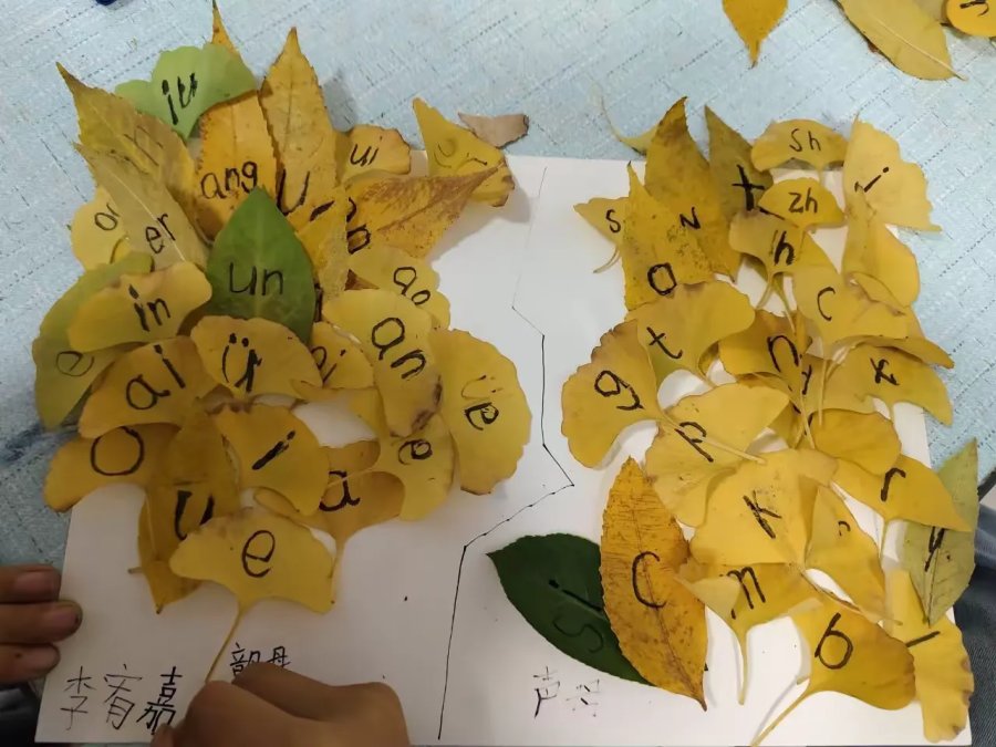 走出教室,孩子们化身“秋日拾光者”,俯身捡拾飘落的银杏叶、斑斓秋叶。小小的叶片成了天然的拼音卡片,稚嫩的笔触将“b、p、m、f”“a、o、e”细细书写,再把这些“拼音信物”妥帖收进“声母篮子”“韵母篮子”,每一片叶子都藏着对拼音的好奇。
