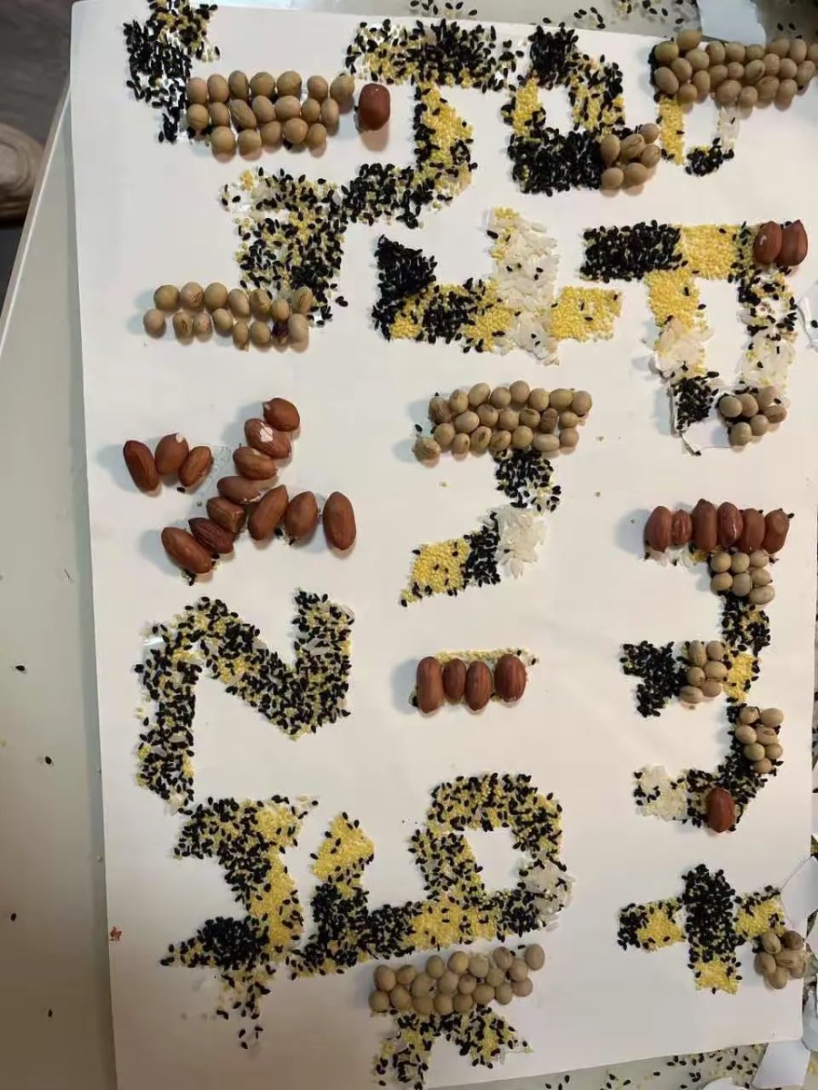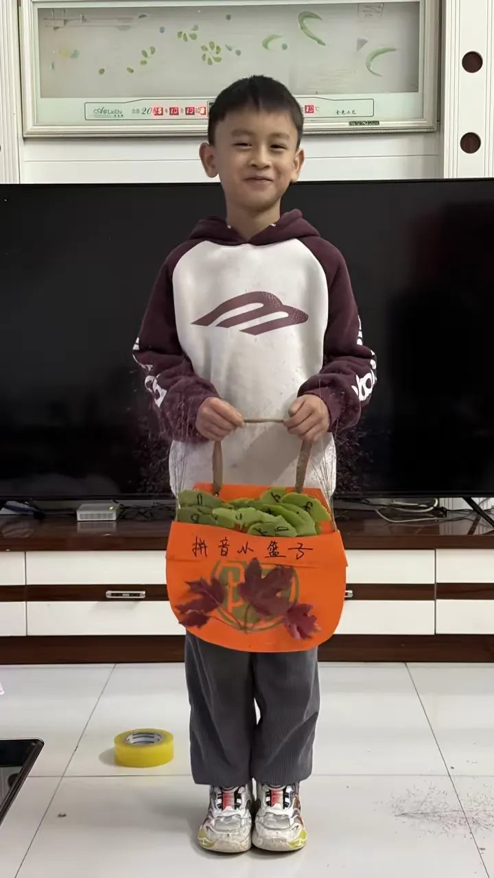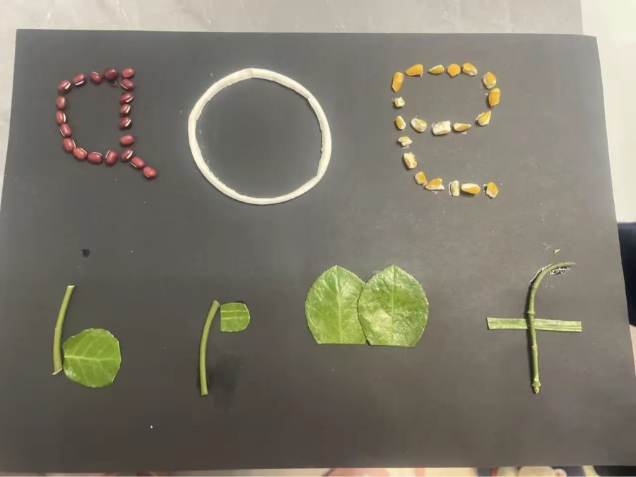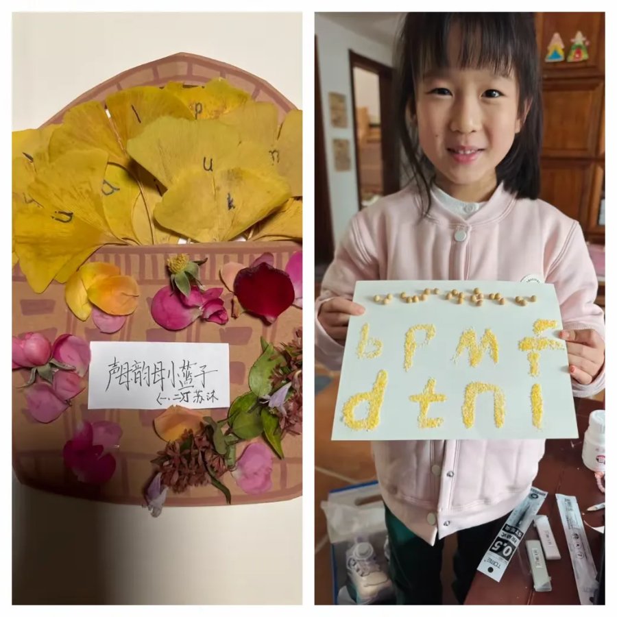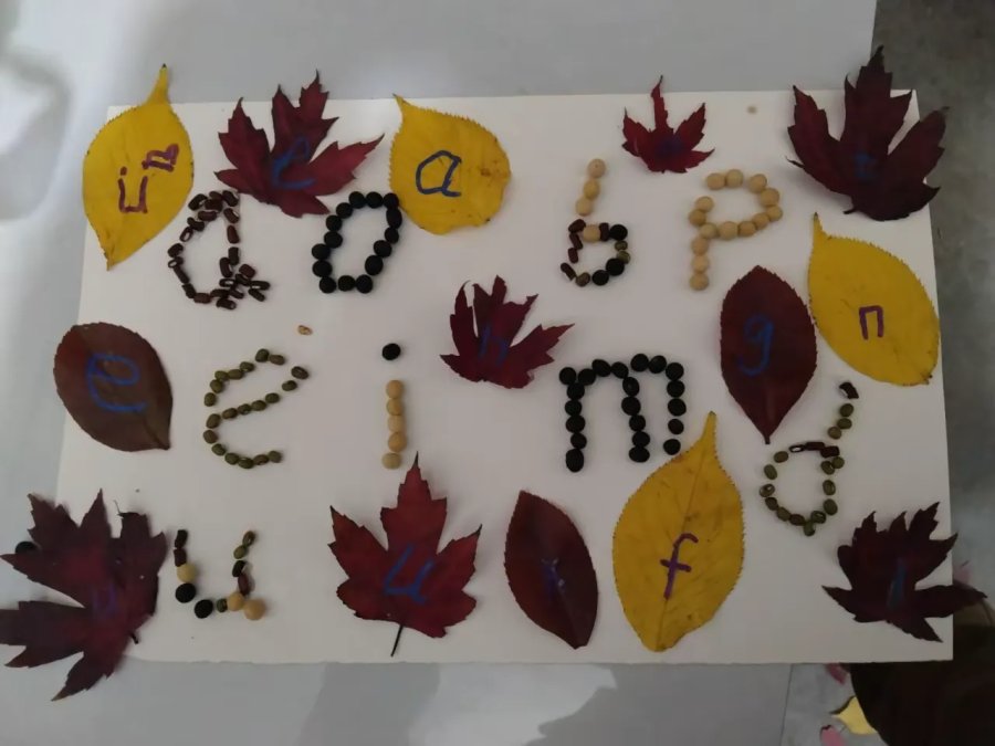 走出教室,孩子们化身“秋日拾光者”,俯身捡拾飘落的银杏叶、斑斓秋叶。小小的叶片成了天然的拼音卡片,稚嫩的笔触将“b、p、m、f”“a、o、e”细细书写,再把这些“拼音信物”妥帖收进“声母篮子”“韵母篮子”,每一片叶子都藏着对拼音的好奇。