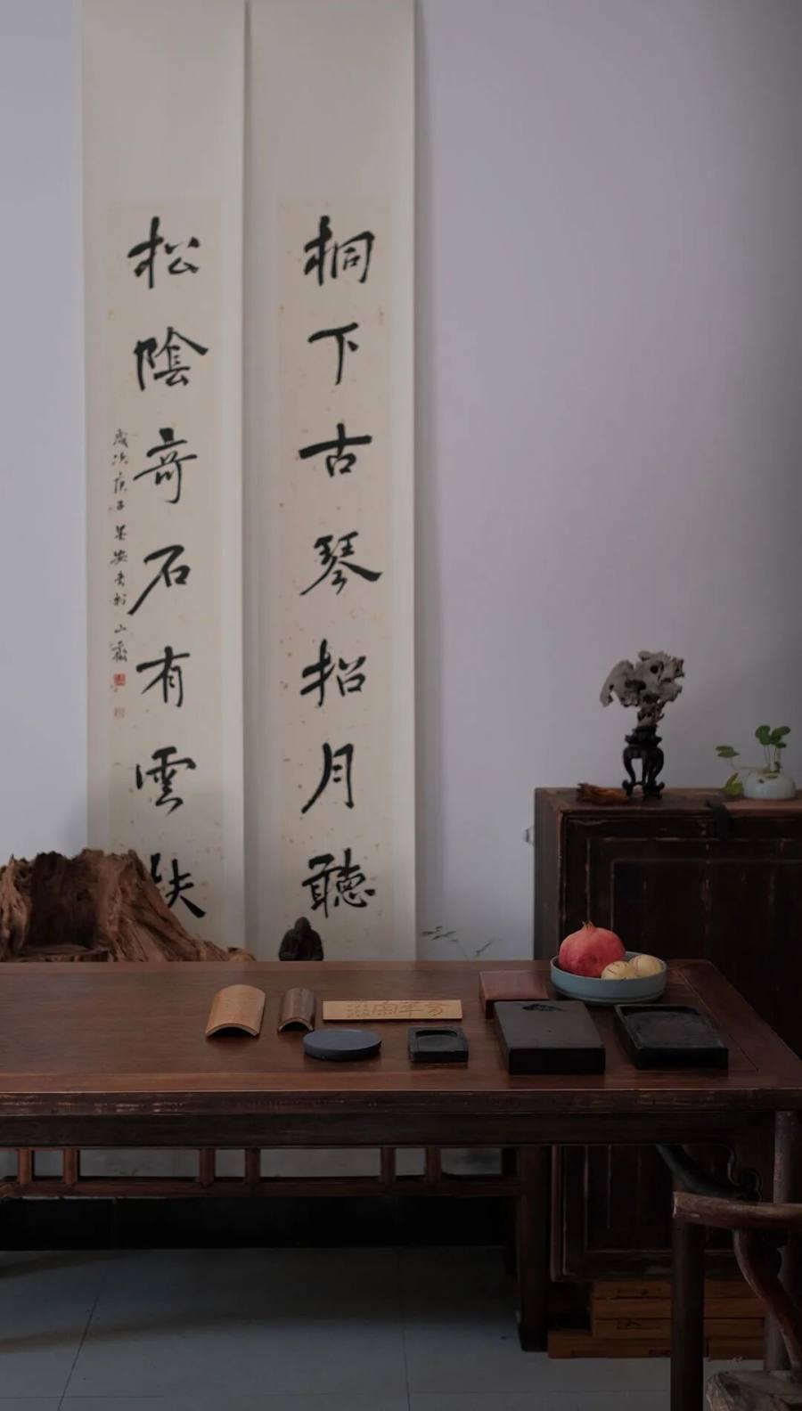 我的画案之侧,也常附庸风雅挂一书房联,前两年拍场看到一件胡公寿所写"静水殊无趋世态,幽禽懒作弄春声",联语深得我心,于是自书一对,悬于斋壁。