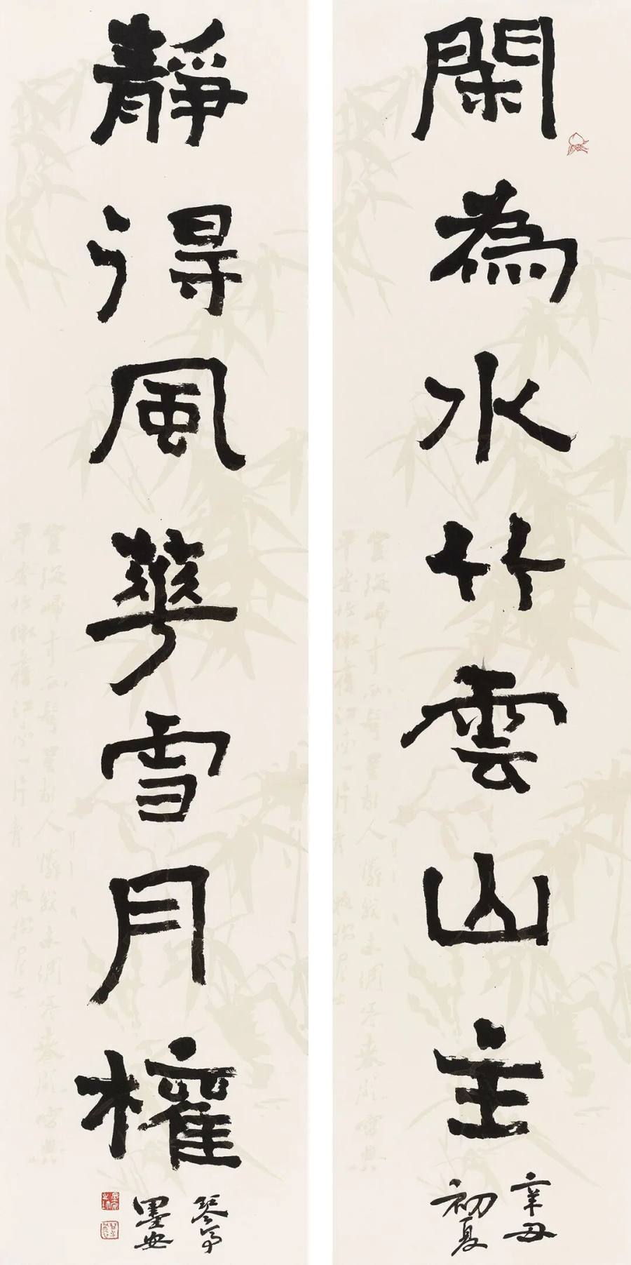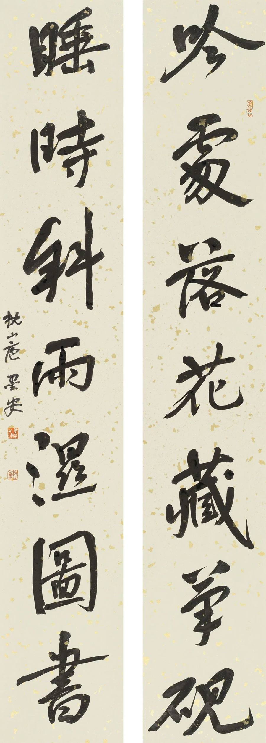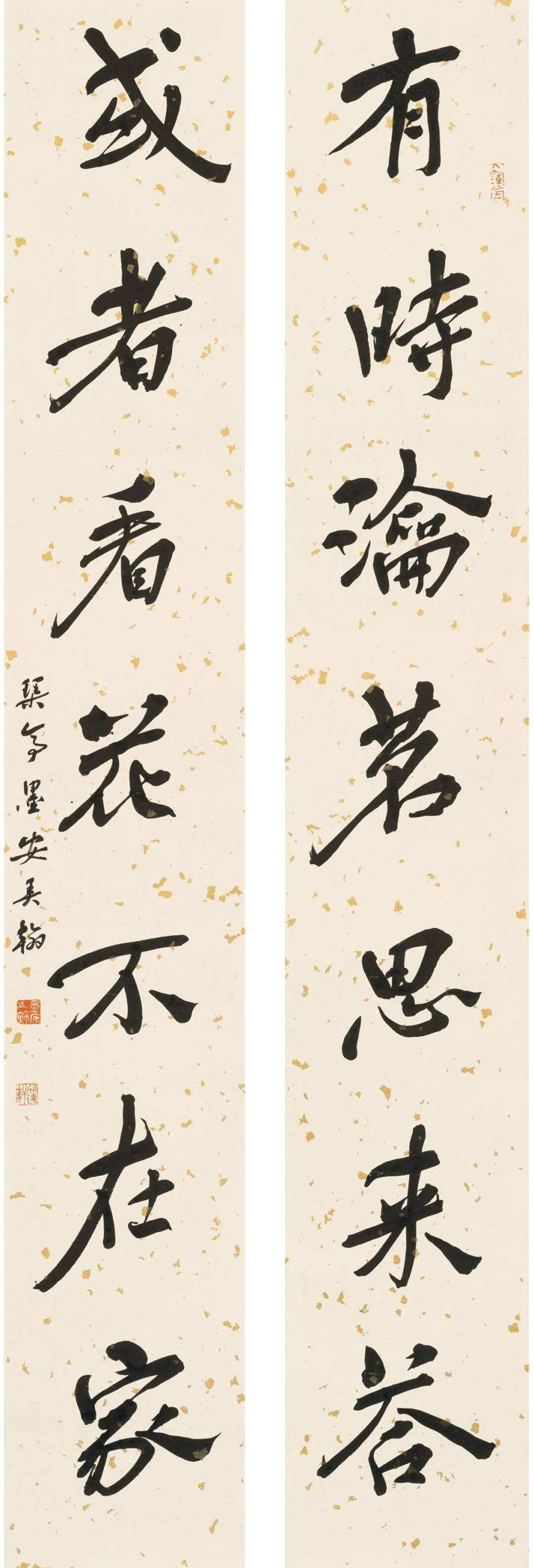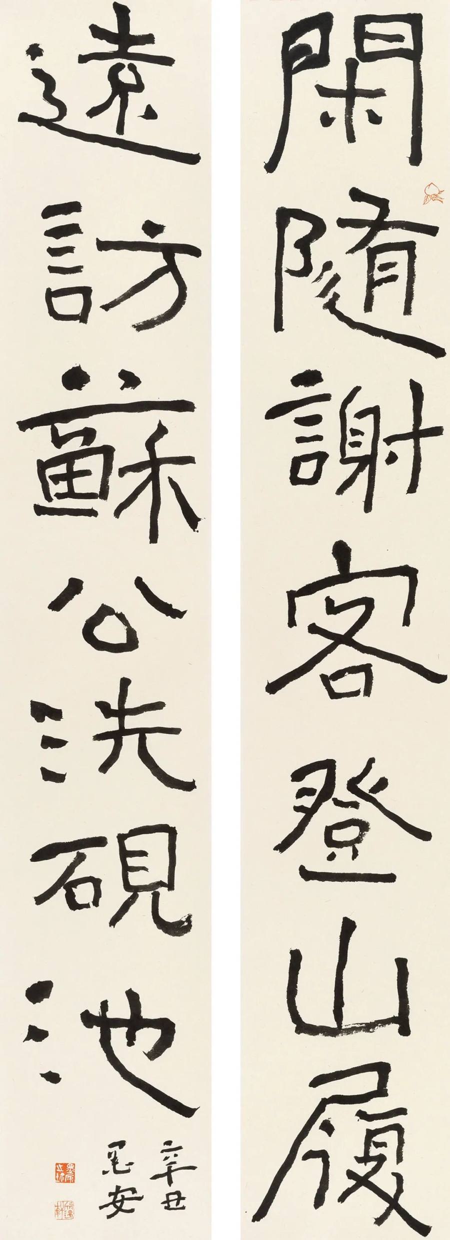 书写对联也非易事,虽只有两行字,其间的大小、虚实、繁简,颇费一番脑筋。近代名家,各有擅场,赵 叔开张痛快,何子贞收放烂漫,沈寐叟奇崛骨感,康有为豪纵苍劲,郑海藏骏爽飞扬,于右任浑厚朴茂,弘一法师静寂深穆,他如翁同和、梁任公、徐生翁亦各有气象。