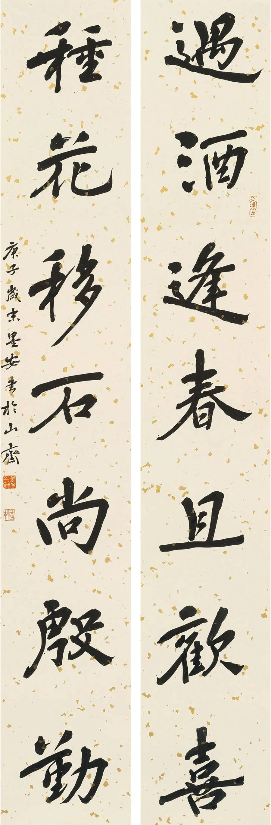对联是清代书法的代表性款式,也是最普遍的一种酬应文艺,一直到民国都十分流行。记得小时候几乎每个村庄都有一两个文化老人,碰到节庆或喜事,便从书桌里掏出一个本子,上面密密麻麻的手抄了许多对联,有过年的、结婚的、祝寿的、哀挽的,也有各种门面铺子开业的,祠堂庙宇落成的。那时街上都卖一种“腊笺”对联纸,天头地脚是木轴,背面用报纸简单糊平,正面倒是油光锃亮,大红色,有的在顶头贴个金色的喜字,这是给新人吉礼上用的喜联。从前我爷爷便村里头这个老人,他喜欢自撰内容,每次写联都要仔细叠好格子,从十多个字到七言五言,最少时是四个字。