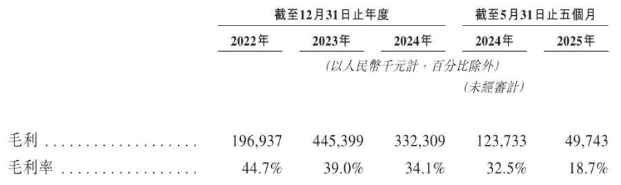 不仅如此,瀚天天成的毛利也出现波动,由2023年的4.45亿元下滑25.4%至3.32亿元,2025年前五个月膝斩至4974.3万元;毛利率更是由2022年的44.7%一路降至2024年的34.1%,截至2025年5月末仅剩18.7%。