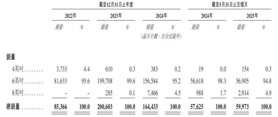 值得注意的是,瀚天天成的8英寸碳化硅外延晶片于2023年5月推出,销量由当年的285片翻倍增至2024年的7466片,2025年前5个月该尺寸产品的销量为2914片,在总销量中的占比进一步提升至4.9%。
