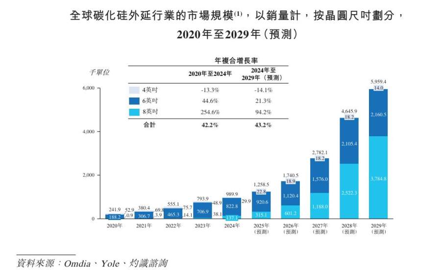 纵观整个市场,8英寸晶片正以其面积较6英吋大1.8倍、边缘裸晶比例由14%降至7%、裸晶数量增加90%等优势逐渐获得市场认可,灼识咨询预计其全球销量将由2024年的10万片增至2029年的380万片,复合年增长率约94.2%。