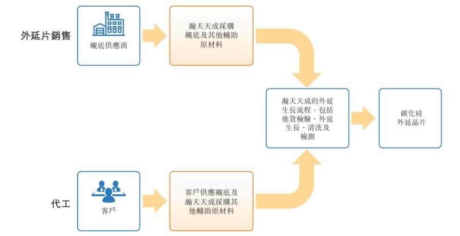 瀚天天成的业务模式分为两种,在外延片销售模式下,该公司自行采购包括衬底在内的原材料进行生产销售,为客户提供一站式解决方案;而外延片代工模式则由客户提供衬底,其生长外延层并交付,向客户收取辅助材料费用及代工服务费。