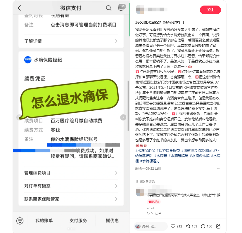 在社交平台上,如何向水滴保申请退费的“维权教程”广泛传播,引发了大量遭遇类似情况的消费者的共鸣。这些消费者本怀着保障自身和家人的美好初衷购买保险,却没想到陷入了一场无休止的扣费噩梦。2024年315期间,中国消费者报就曾曝光水滴保百万医疗险销售存在“低价陷阱”。其广告以“每月1.9元投保600万医疗险”为噱头吸引用户,消费者点击“同意并投保”后,次月起保费却跳涨至191.3元。客服竟将此辩解为“用户误操作升级”,而所谓的“升级”无需额外确认,仅仅是页面设计存在严重误导。由于默认开通自动续费,大量消费者在发现被持续扣款后,投诉声不断,却又往往陷入维权困难的境地。