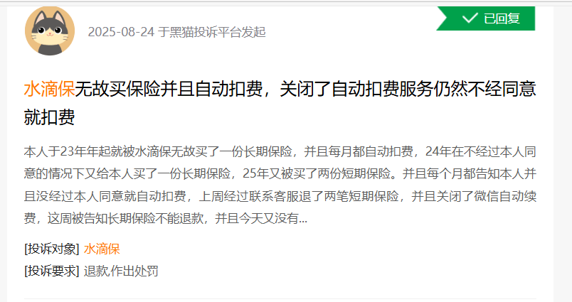 水滴保作为水滴公司旗下的互联网保险中介平台,本应是消费者信赖的保险选购渠道,但如今却成了“乱扣费”的重灾区。据新浪Insights报道,黑猫投诉平台上,关于水滴保的投诉多达1851条,且数量仍在持续攀升。近期投诉集中爆发,消费者纷纷控诉被无故购买长期保险,或是未经明确授权就被自动扣费。