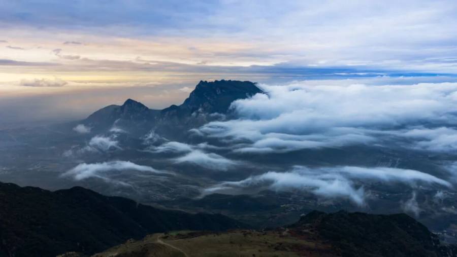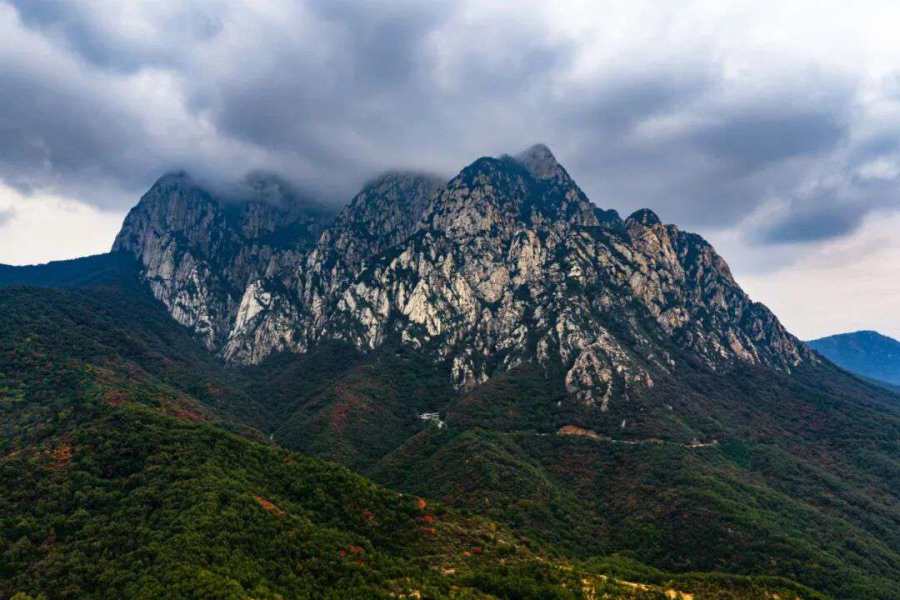 首日抵达时,恰逢一场细雨初歇,雨后的嵩山被一层轻薄的水汽包裹,云海如轻纱般漫过群峰之巅,连中岳庙景区的朱红宫墙、飞檐斗拱也浸润在湿润的秋意里。无人机缓缓升空,镜头下的景致愈发惊艳 —— 主景区内枫红似火、松绿如黛,斑斓秋叶点缀在云雾间;中岳庙的古柏群则与云海相映,虬枝苍劲托着漫卷云絮,红墙琉璃在朦胧雾气中若隐若现,宛如从历史画卷中走出的仙境。