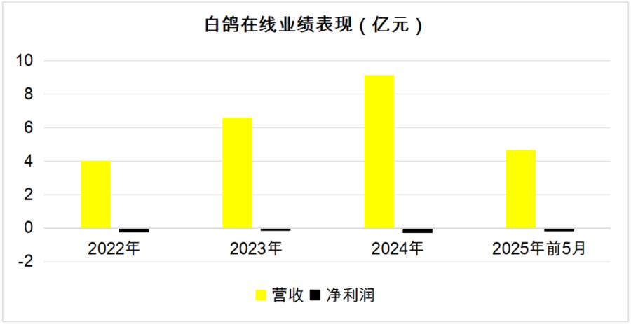 招股书显示,2022年—2024年以及2025年前5个月,白鸽在线录得的收入分别为4.05亿元、6.6亿元、9.14亿元、4.67亿元,对应净利润依次为-0.25亿元、-0.17亿元、-0.28亿元、-0.19亿元。