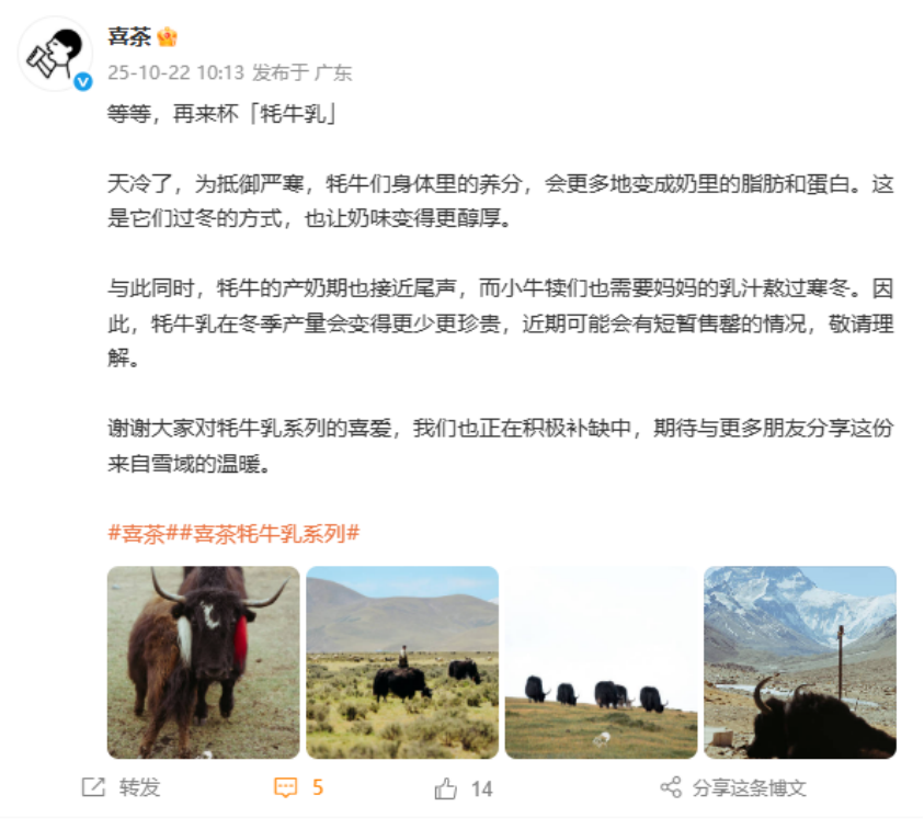 这也进一步带动了「雪域·牦牛乳恰安莫」的售罄情况,越来越多的消费者发帖询问“「雪域·牦牛乳恰安莫」又断货?”。10月22日,喜茶官方回应:原料牦牛乳冬季产量变化,近期可能会有短暂售罄的情况,目前正在积极补货中。