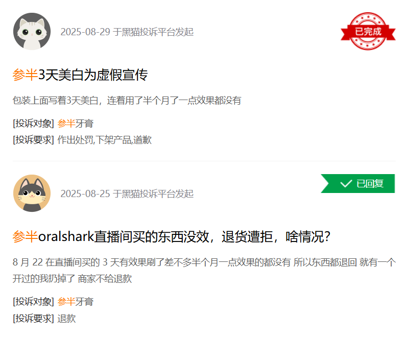 黑猫投诉平台上,共有379条投诉中包含搜索词“参半”,其中多条与美白效果有关,“商家虚假宣传牙膏三天美白,用一个月啥效果没有”;“商品包装及直播间均宣传3天美白,使用完两罐均未达到宣传效果”。