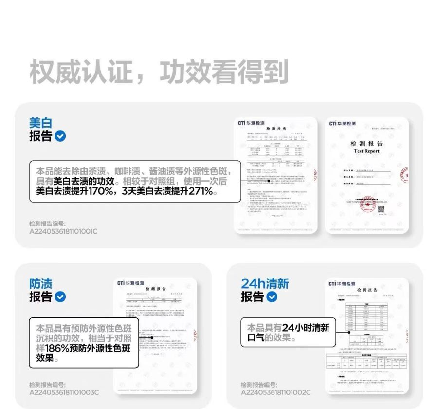 产品的销售页面,确实有检测报告,但具体检测内容却很难看清。只是有大字写着“相较于对照组,使用一次后美白去渍提升170%,3天美白去渍提升271%具有美白去渍的功效。”