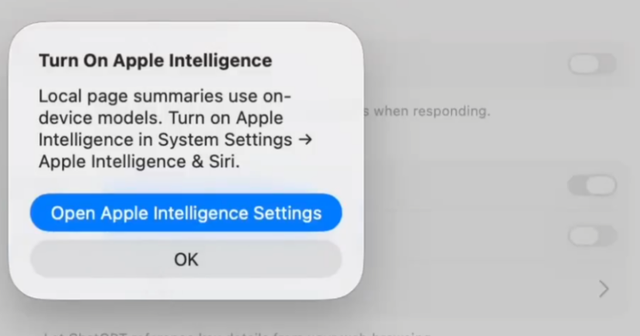 Atlas里专门有个打开苹果智能的选项,打开后就可以通过本地的处理器来总结网页,而不是通过ChatGPT的服务器,同时还支持Siri唤醒。