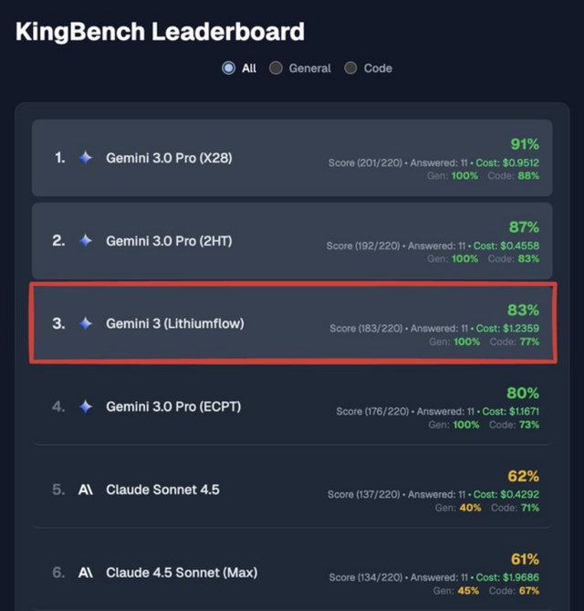 而就在此前,谷歌的下一代基座大模型Gemini 3在KingBench上刷榜。所以大家就觉得,谷歌会像Gemini 2.5预览版那样的策略一样,将Gemini 3性能最低的版本以预览版的形式发布在AI Studio上。
