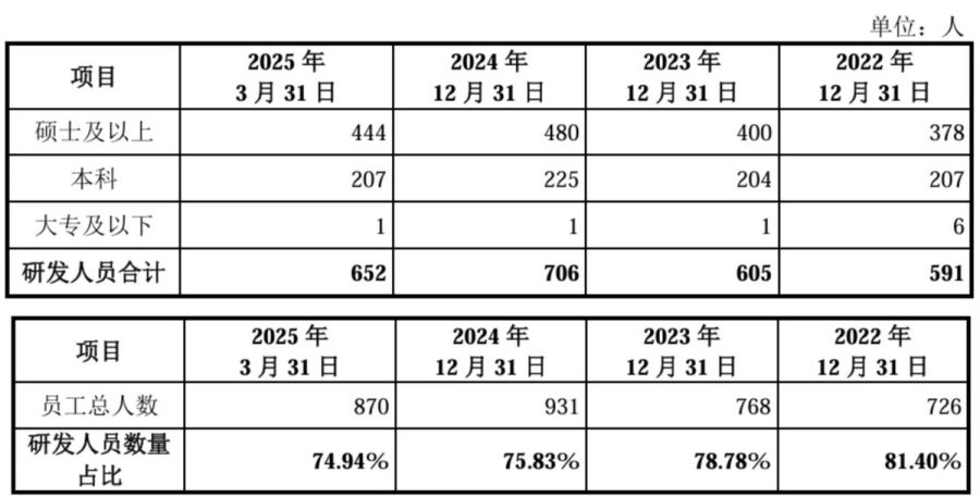 但需要注意的是,作为芯片设计类企业研发创新的基础,沐曦股份的研发人员数量却存在一定波动,截至3月末拥有研发人员652名,与2024年末706名的研发人员规模相比减少了54人,占比也下滑0.89个百分点至74.94%。