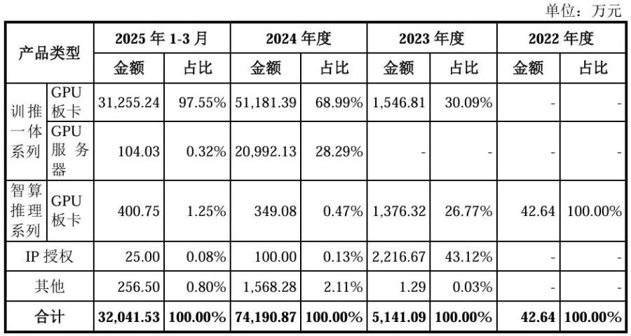 其中,2023年推出曦云C系列训推一体GPU产品,是沐曦股份收入增长的主要来源,该项产品收入由2023年的1546.81万元飙升至2024年的5.12亿元;2025年第一季度的销售收入达到3.13亿元,占主营业务收入比例的97.55%。