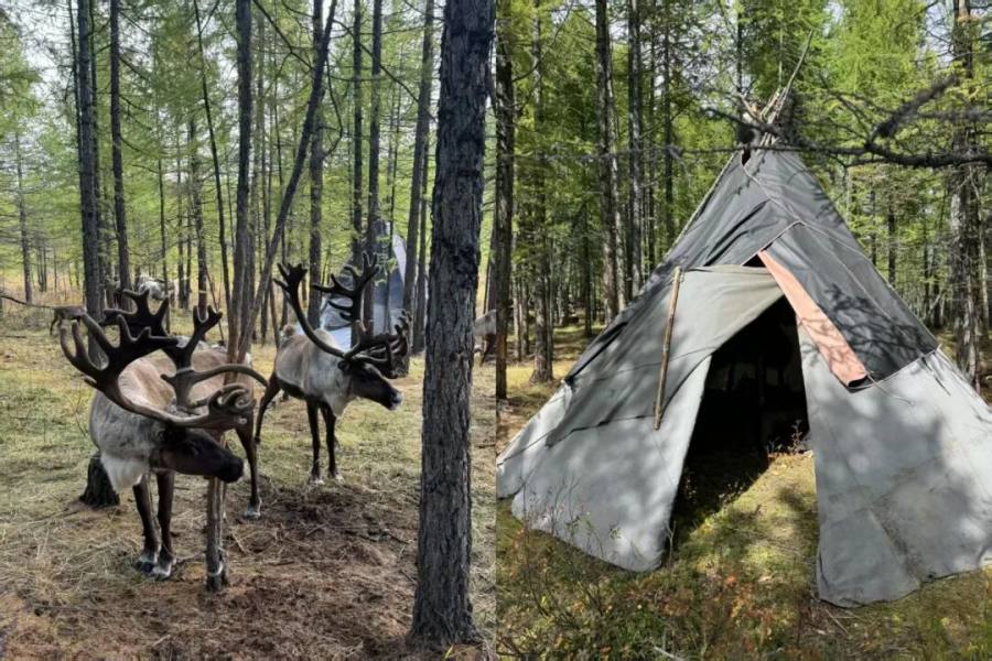 *人工养殖的驯鹿和木帐篷(受访者供图)