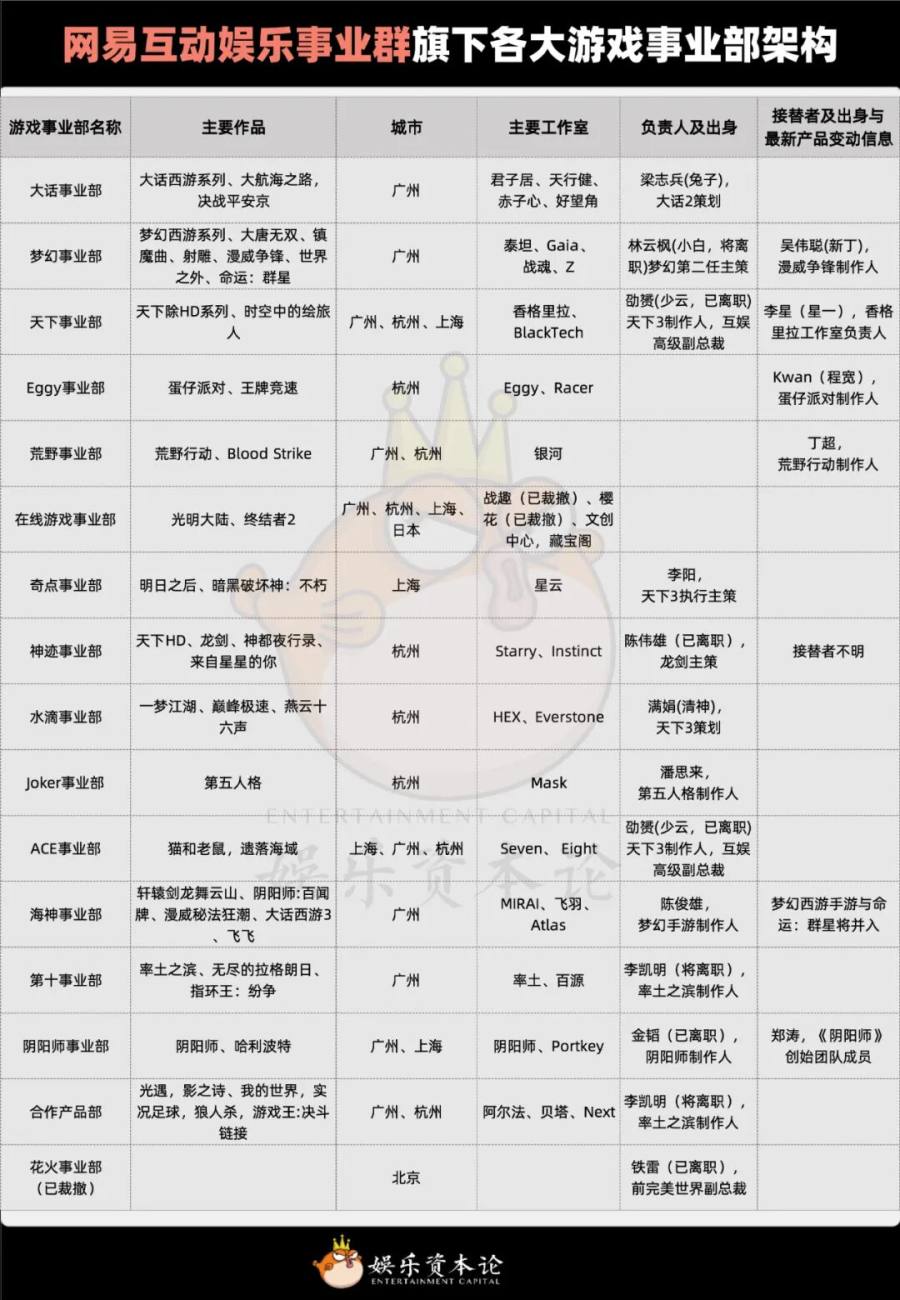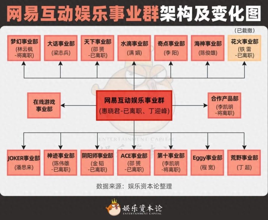 首先是2023年,网易互娱负责华东区域业务的联席总裁惠晓君(天佑)被退休,接着网易游戏高级副总裁、天下事业部总裁邵赟(少云)于2024春节后离职,且天下事业部被一拆三分为Eggy事业部、荒野事业部与天下事业部。
