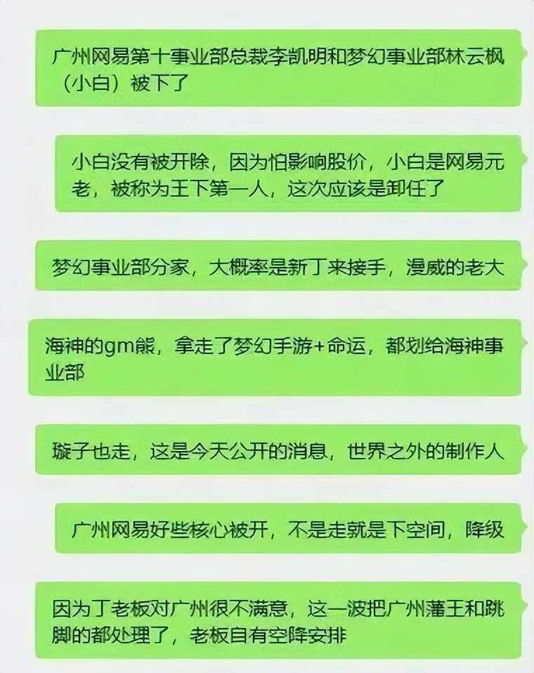 昨日,一张关于网易互娱事业群广州各大事业部高管发生人事“大地震”的微信截图在行业内以及社交平台上流传,其中梦幻事业部总裁林云枫(小白)与第十事业部总裁李凯明均传被“卸任”,其中梦幻事业部还要步去年的天下事业部的后尘,被拆分、重组。