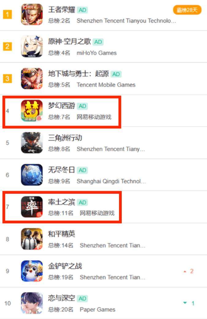 今日网易只有《梦幻西游手游》与《率土之滨》进入畅销榜Top10行列