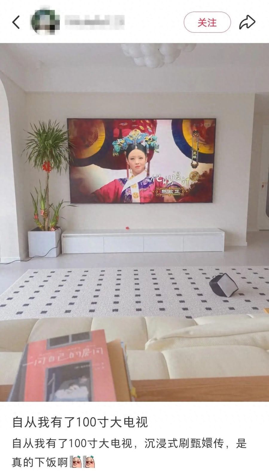 比如网友拍摄自己在大屏前追剧的片段发布到社交平台,有些观众会在客厅布置好灯光、投影仪,营造一种“陪伴式观剧”的生活仪式感,有些观众会与大屏里的角色人物互动玩梗,发布到社交平台就会容易爆梗出圈。