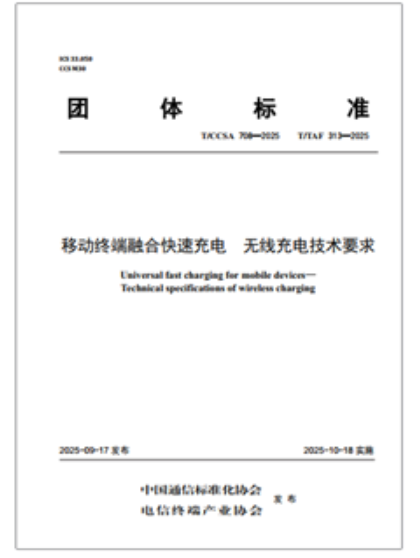 近日,据媒体报道,中国通信标准化协会(CCSA)近日宣布,联合电信终端产业协会(TAF)共同制定,并由中国信息通信研究院携手国内主流终端与芯片企业联合起草的T/CCSA 708-2025(T/TAF 313—2025)《移动终端融合快速充电 无线充电技术要求》团体标准正式发布。该标准是国内首个支持高功率融合充电技术的无线快充标准。