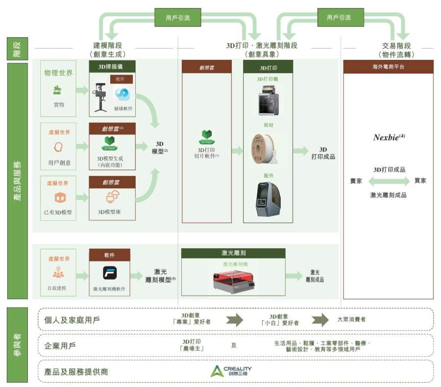 创想三维在招股书中称,该公司凭借品牌及技术专长扩展了产品线,涵盖3D扫描仪、激光雕刻机及配件,并在近期出了专注于3D创意成品的海外电商平台Nexbie,旨在构建共生共荣的3D创意生态闭环。
