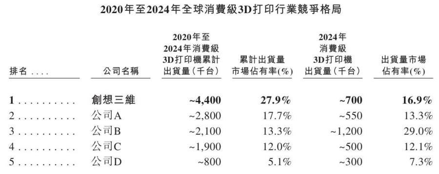 根据同一资料来源,创想三维是全球最大的消费级3D打印产品及服务提供商,全球市场占有率为27.9%。不过,这个“全球最大”的称号前还有一个不容忽视的限定词——按2020年至2024年消费级3D打印机的累计出货量计算。
