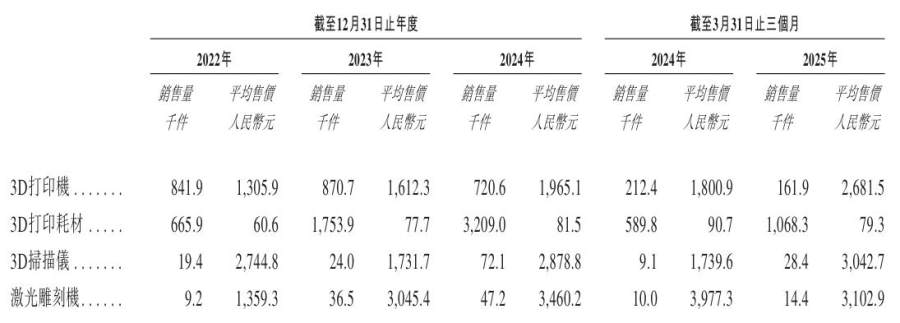创想三维在招股书中强调,3D打印机是消费级3D打印行业中的核心硬件,累计出货量反映了活跃用户群的规模和黏性,是产品渗透率的有力指标。然而,该公司近年来3D打印机的销售数量却出现了明显减少。