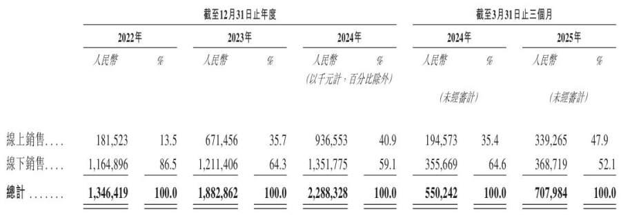 招股书显示,创想三维来自线上销售的收入由2022年的1.82亿元增至2024年的9.37亿元,占比也由13.5%增至40.9%,呈现几何式增长。2025年一季度,该公司线上销售收入占比已经达到47.9%,几乎撑起了其总收入的半壁江山。