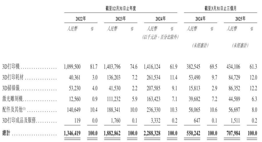 从产品创收的角度出发,创想三维近年来3D打印机业务的收入占比也有所降低,由2022年的81.7%降至2024年的61.9%。2025年第一季度,该项业务的收入为4.34亿元,在总收入中的占比进一步降至61.3%。