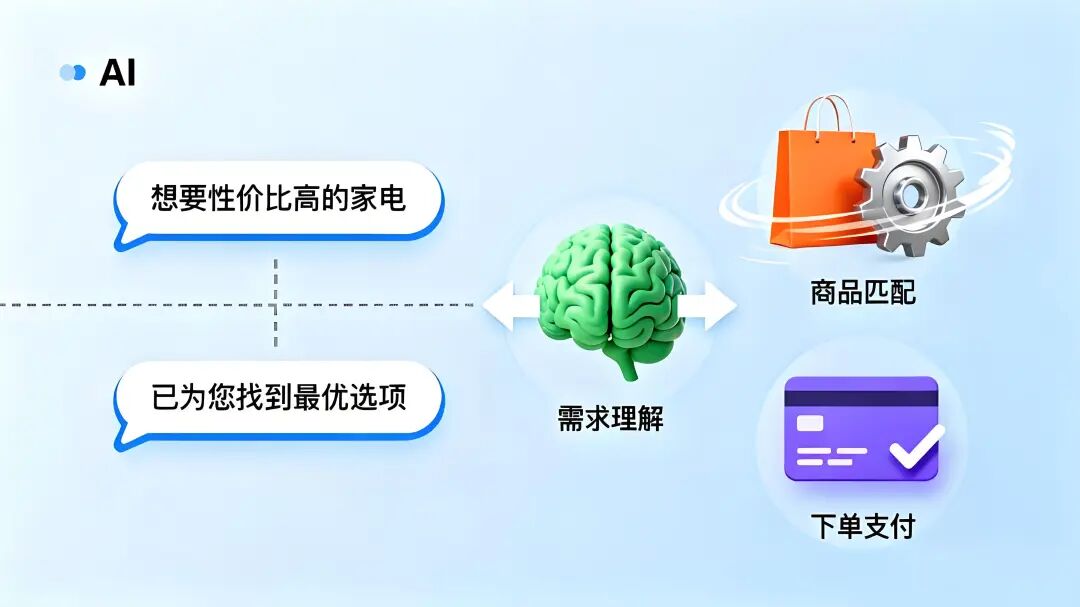 这种转变的核心逻辑在于,大模型的自然语言交互能力能够降低购物的决策门槛。用户无需再面对复杂的商品分类和搜索筛选,只需通过对话表达需求,AI即可完成从需求理解、商品匹配到下单支付的全流程操作。这种“对话式购物”模式,更符合人类的沟通习惯,尤其能够吸引不熟悉电商操作的中老年用户,拓展消费群体边界。