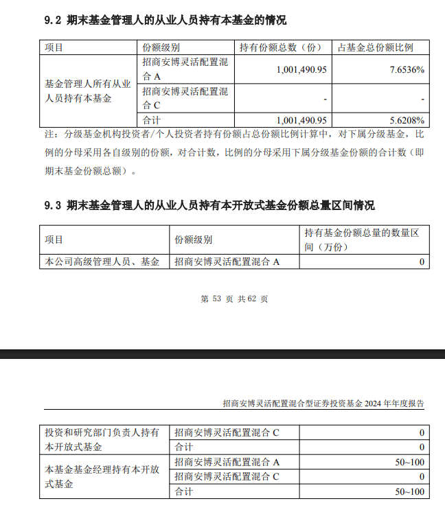 而有趣的是,在机构撤出的同时,作为基金经理的张西林自己也在今年悄然撤出亏损的基金。该产品的2024年年报显示,内部人员持有100.15万份额,占比5.62%,其中基金经理持有区间为50~100万份;而到了今年上半年末,内部持有比例降为了26.31万份,占比1.73%,基金经理持有份额区间也变成了10~50万份。