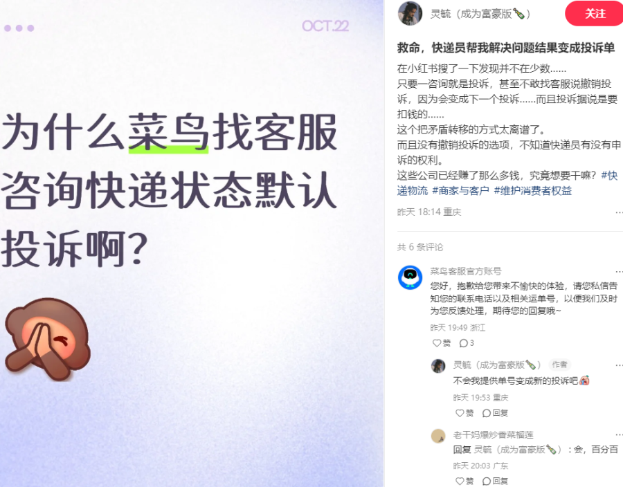 2025年10月22日,网友灵毓(成为富豪版)在小红书这样写到,“只要一咨询就是投诉,甚至不敢找客服说撤销投诉,因为会变成下一个投诉,而且据说投诉是要扣钱的,另外没有撤销投诉的选项,不知道快递小哥有没有申诉的权利。”
