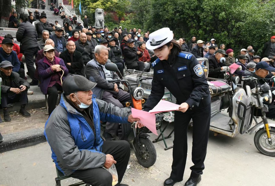 为了让宣传内容入脑入心,民警还设计了互动提问环节,“骑电动三轮车能载几岁以下的孩子?”“骑自行车必须年满多少周岁?”等问题抛出后,村民们纷纷举手抢答,答对的村民当场获得头盔、水杯等小奖品,现场气氛热烈。活动最后,宣传交警向村民们发放了交通安全宣传页,进一步巩固宣讲效果。(新密市公安局交警大队:申建忠 陈雪峰 王蓓蕾)
