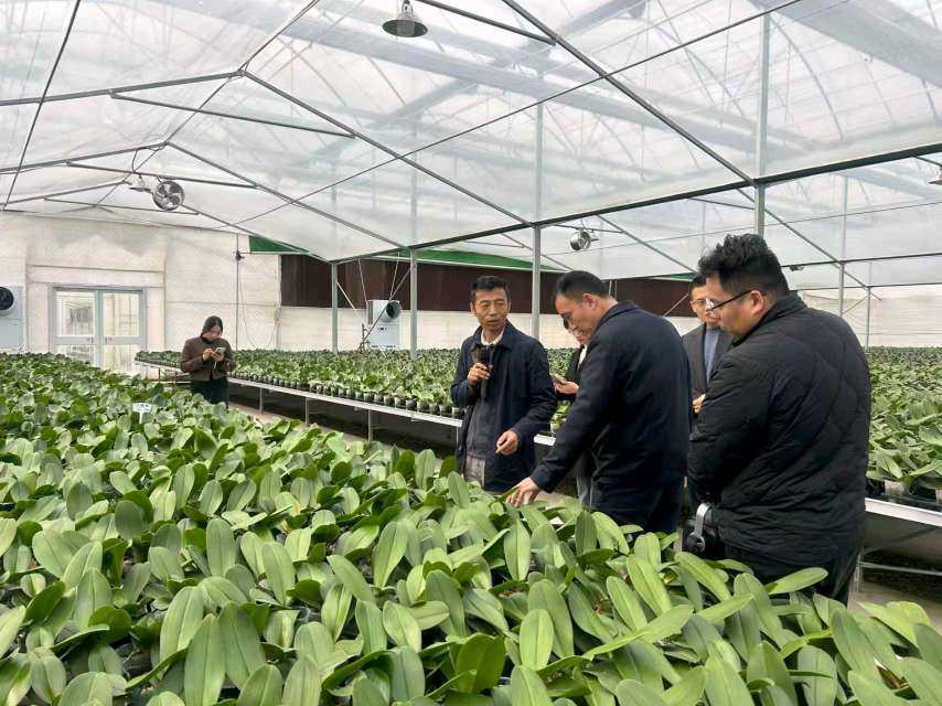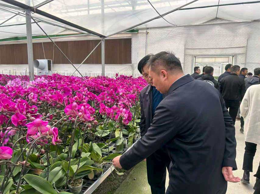 随后,观摩团深入温室大棚实地查看。在盛放的蝴蝶兰展区,成员们仔细观察花型品相,询问花期调控、病虫害防治等技术细节;在种苗培育区,大家了解到基地通过组培技术实现品种迭代,当前主打“大辣椒”“满天红”等市场热销品种,年销售额超800万元。