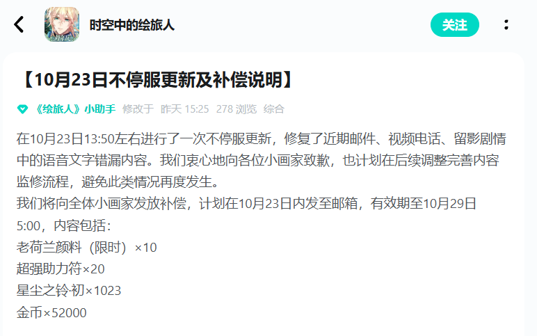 为表歉意,官方推出包含老荷兰颜料(限时)、超强助力符、星尘之铃等道具的补偿礼包,于当日发放至玩家邮箱,有效期至10月29日。公告同时承诺“优化内容监修流程”,避免同类问题重演。