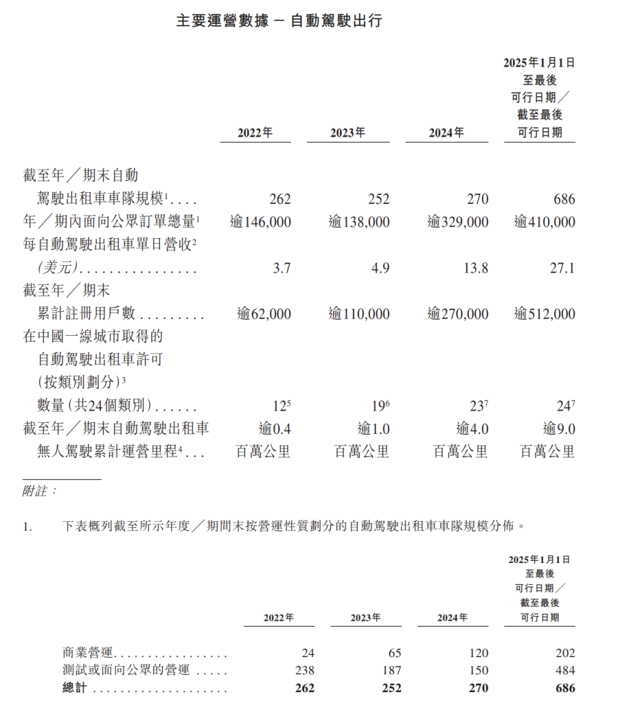 从经营数据看,两家公司想表达的重点也截然不同。小马智行的披露极为细致:不仅拆分Robotaxi与卡车的车队规模、单车日营收、累计无人化里程,还细化至自营与第三方租赁比例、商营与测试车数量等。