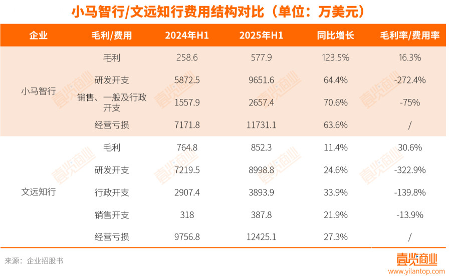 2025年上半年,小马智行研发支出达 9651.6 万美元,同比增长 64.4%;文远知行研发支出为 8998.8 万美元,同比增长 24.6%。研发费用占营收比例分别高达 272% 和 323%,也就是说,两家公司赚一美元,要花三美元去做研发。